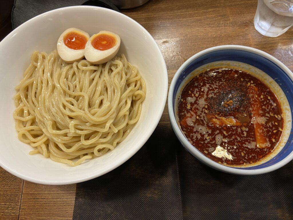 定番メニューは”中華そば”なのですが、しっかり別メニューの”味玉辛つけ麺”を食しました。